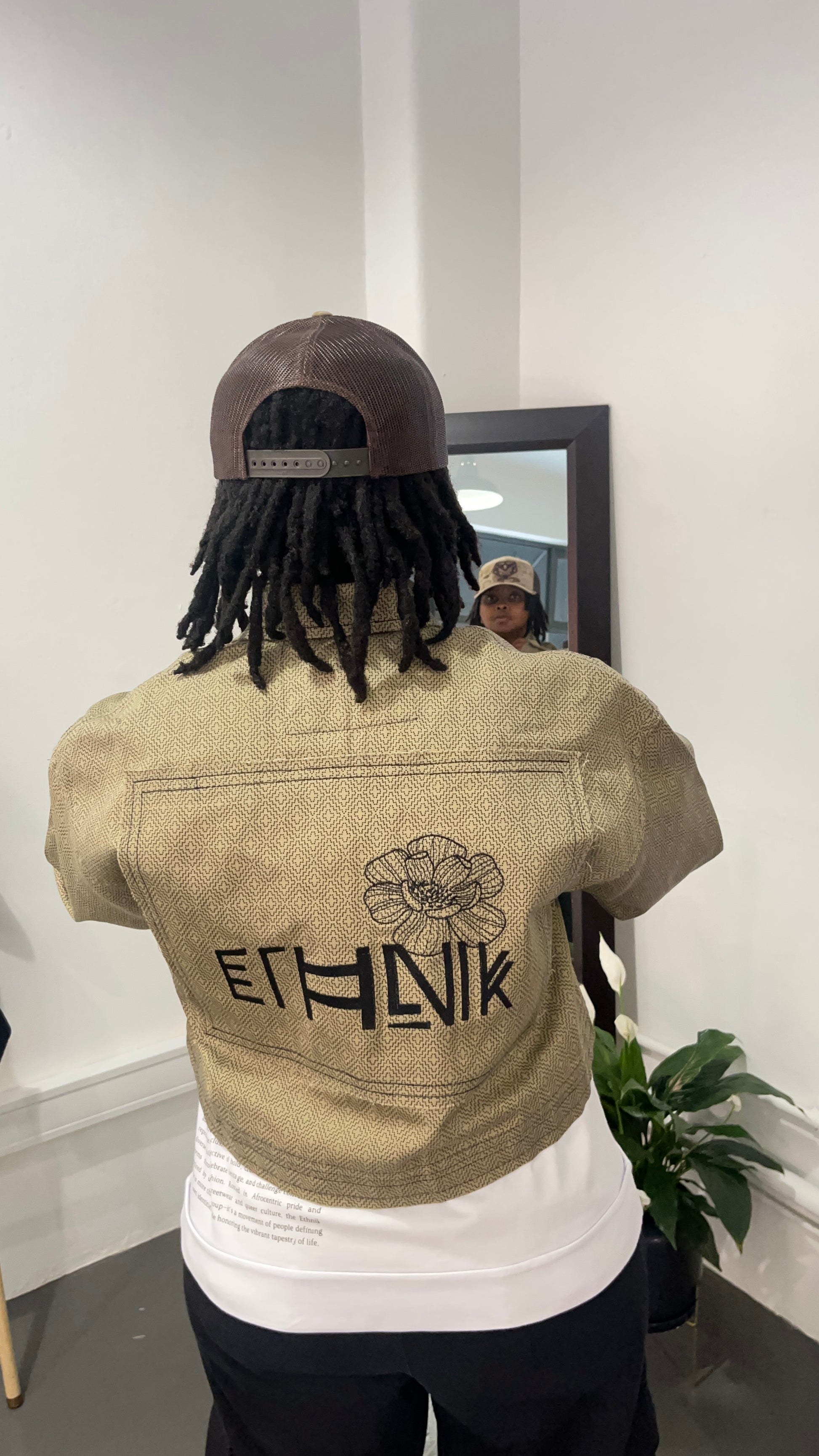 Switch up your style with ease. This 100% cotton jacket features a Velcro-detachable bottom half, giving you two looks in one – wear it cropped or full-length. Designed with a soft Peter Pan collar, press stud closure, and finished with a bold embroidered Ethnik motif on the back, it’s a streetwear statement made for everyday expression.