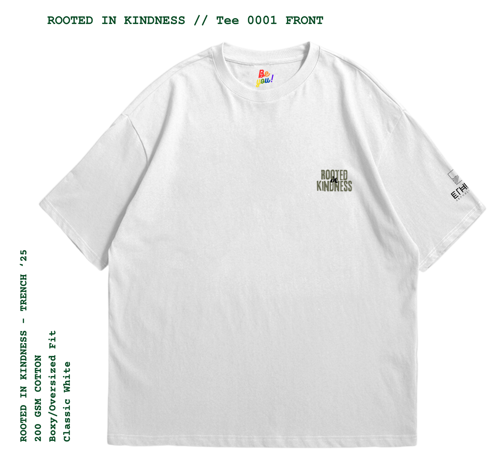 200gsm short-sleeved, Boxy-fit T-shirt made from 100% cotton with a front pocket size Rooted In Kindness and back “Ethnik Trench” Graphic.